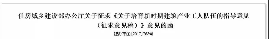 2017年11月,住建部印發(fā)關(guān)于《關(guān)于培育新時期建筑產(chǎn)業(yè)工人隊(duì)伍的指導(dǎo)意見(征求意見稿)》(建辦市函[2017]763號)。
